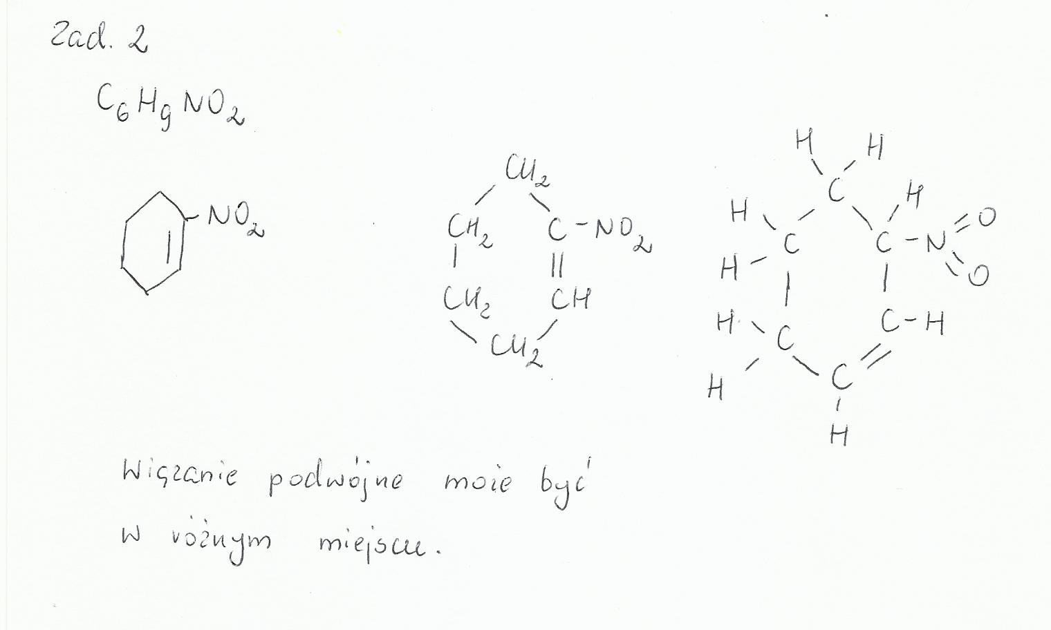 Wydaje mi się,że w zadaniu 2 bardziej prawdopodobny byłby związek pierścieniowy - ponieważ węglowodory łańcuchowe nie ulegają reakcji nitrowania.
