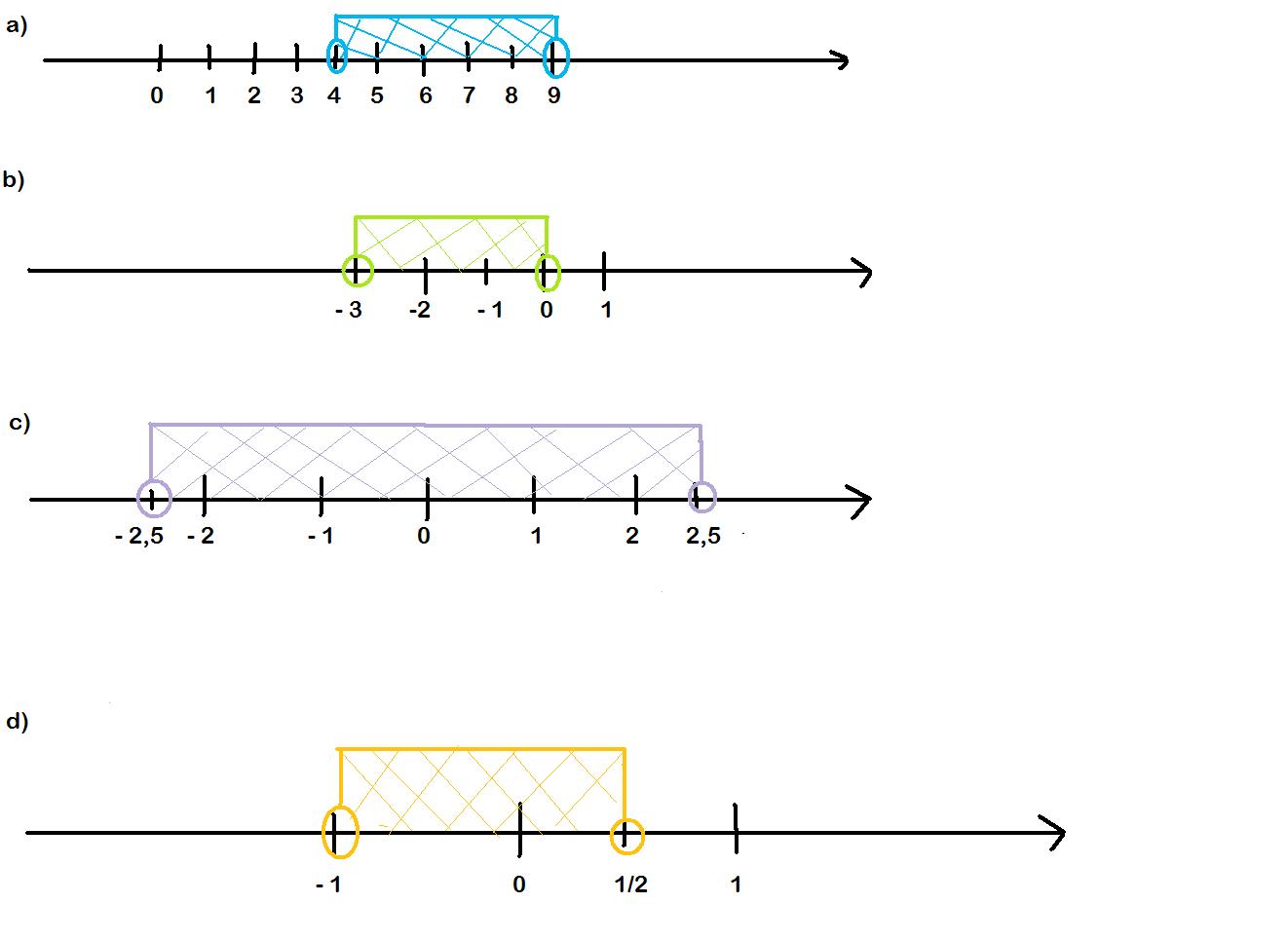a) 4 <x<9 b)-3<a<0 c)-2,5<s<2,5 d ) -1 <y <1/2