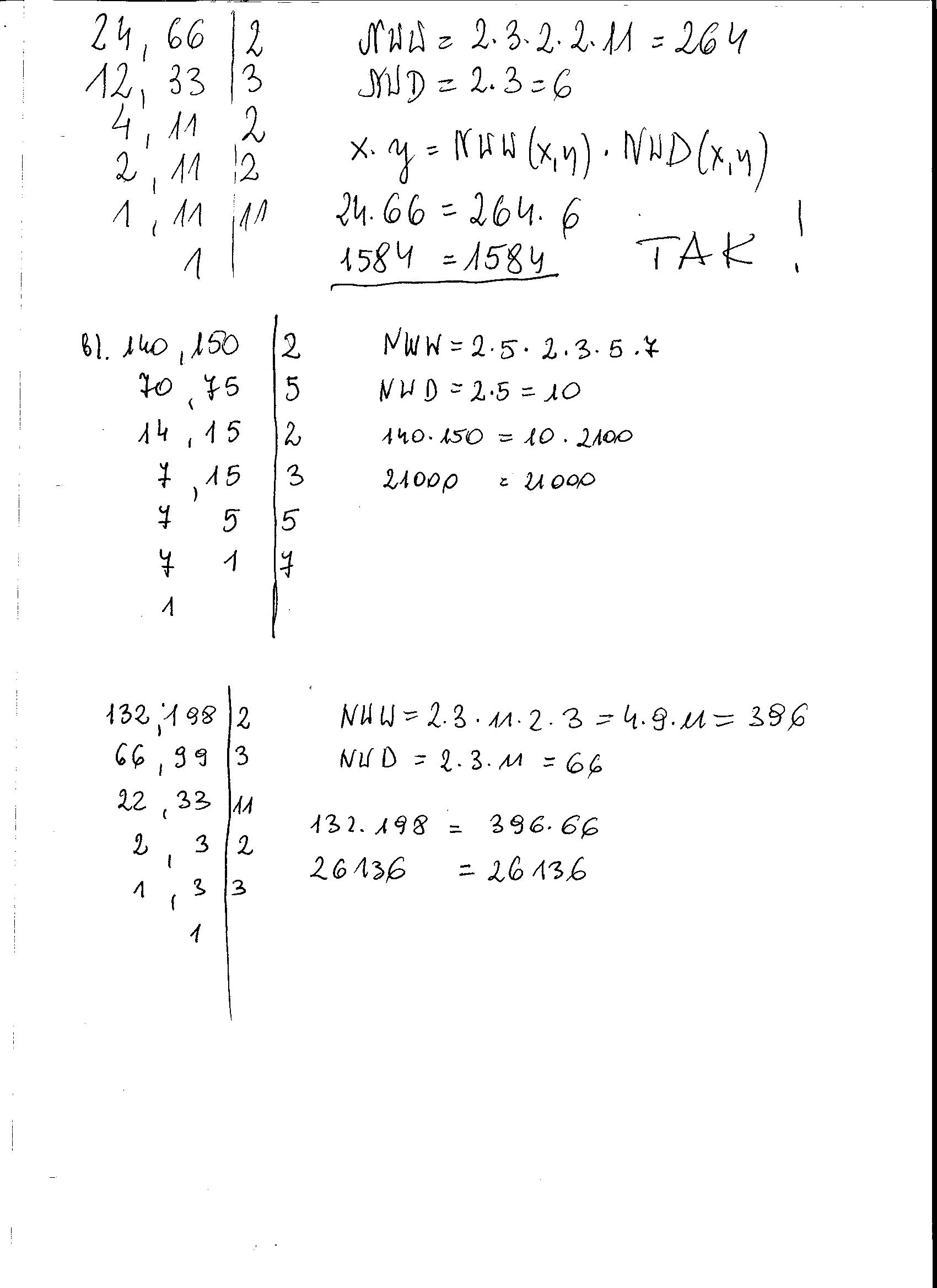 Oblicz NWD(x,y) i NWW(x,y). Uzasadnij, ze NWD (x,y)|NWW(x,y). Sprawdz, czy xy=NWD(x,y) · NWW (x,y).