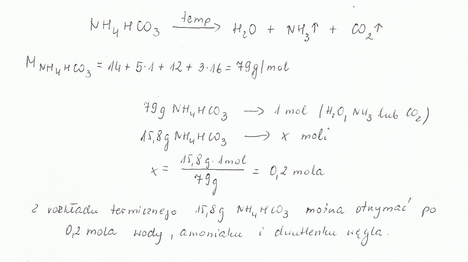 0,2 mola NH4HCO3 otrzymamy odpowiednio: 0,2 mola NH3; 0,2 mola H2O oraz 0,2 mola CO2