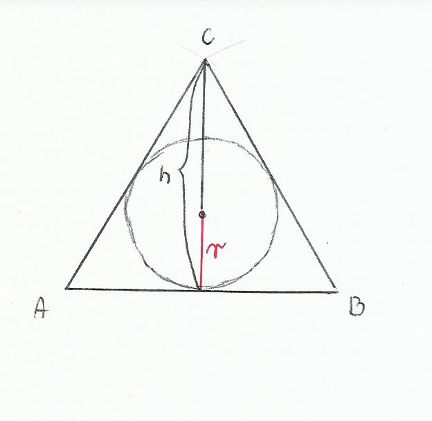 (bo akurat w trójkącie równobocznym wysokości i środkowe pokrywają się, a w każdym trójkącie punkt przecięcia środkowych dzieli je w stosunku 1 : 2, więc krótszy kawałek stanowi 1/3 środkowej, a w wypadku trójkąta równobocznego odpowiada to 1/3 wysokości i jednocześnie promieniowi okręgu wpisanego).