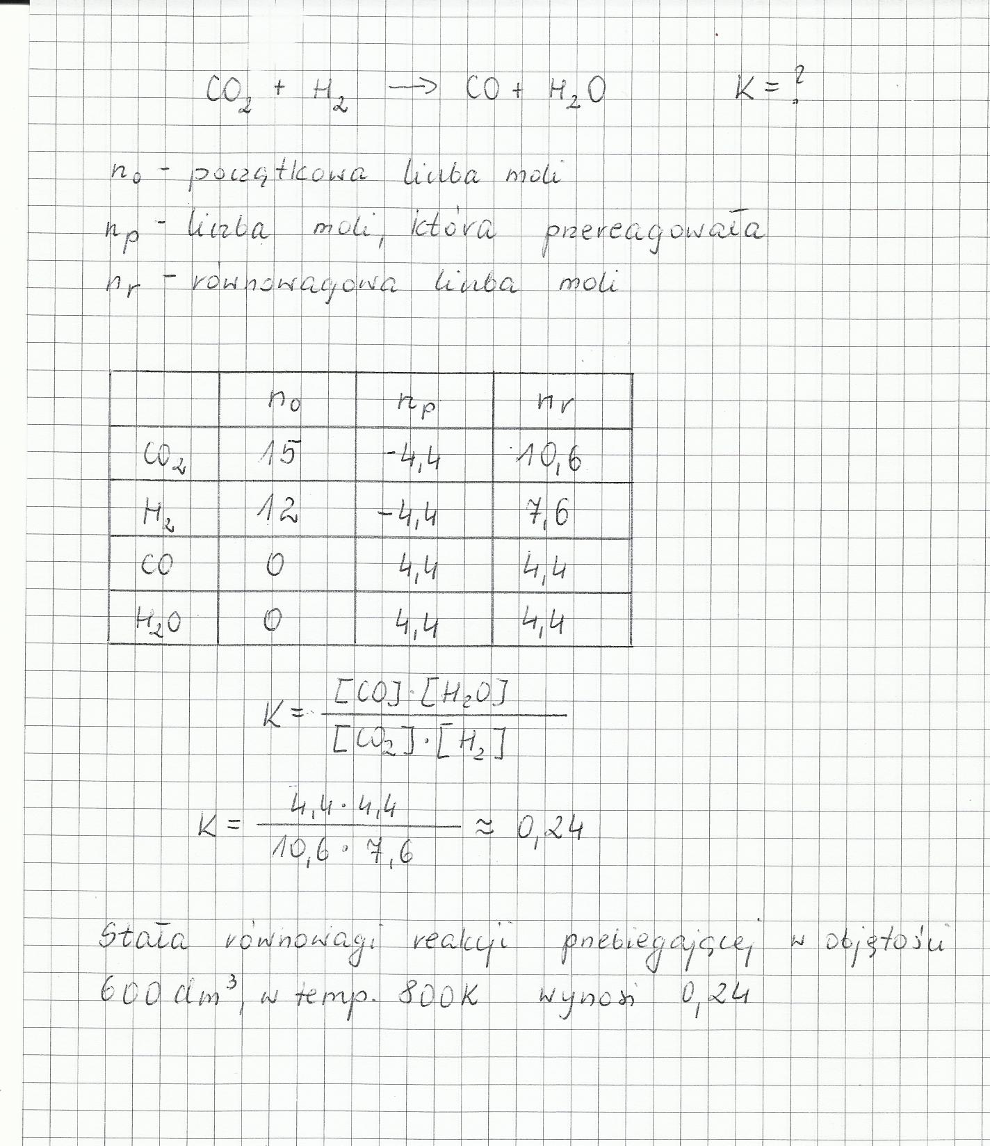 Mieszaninę 15 moli CO2 i 12 moli H2 ogrzano w zamkniętym naczyniu o objętości 600 dm^3 do temp. 800K. Po ustaleniu się równowagi stwierdzono że w naczyniu znajduje się 4,4 mola CO. Oblicz wartość stałej reakcji: