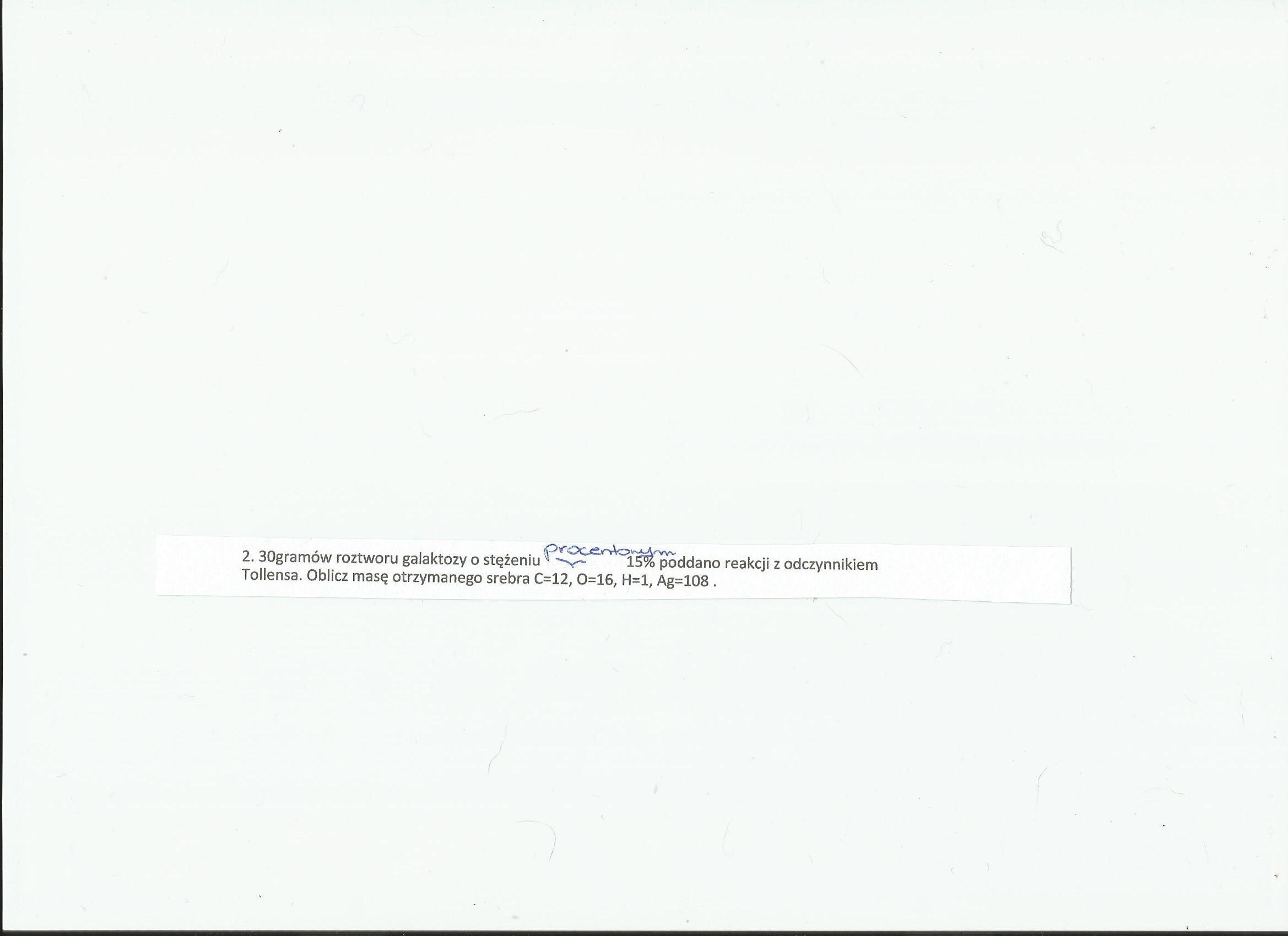 Uproszczone równanie reakcji : C_{6}H_{12}O_{6} + Ag_{2}O \to C_{6}H_{12}O_{7} + \downarrow 2Ag obliczamy masę molową galaktozy : M_{galaktoza}=6\cdot 12 + 12\cdot 1+6\cdot 16=180g/mol obliczamy ilość galaktozy w 30g 15% roztworu : 30g\cdot 15\%=30g\cdot 0,15=4,5g \ galaktozy Z reakcji wynika,że 1 mol galaktozy (180g) powoduje wytrącenie 2 moli srebra (2*108g) : 180g \ galaktozy \to 2\cdot 108g \ Ag 4,5g \ galaktozy \to x \ g \ Ag x=\frac {4,5g\cdot 2\cdot 108g} {180g}=5,4g \ Ag odp.Ilość otrzymanego srebra wynosi 5,4g.