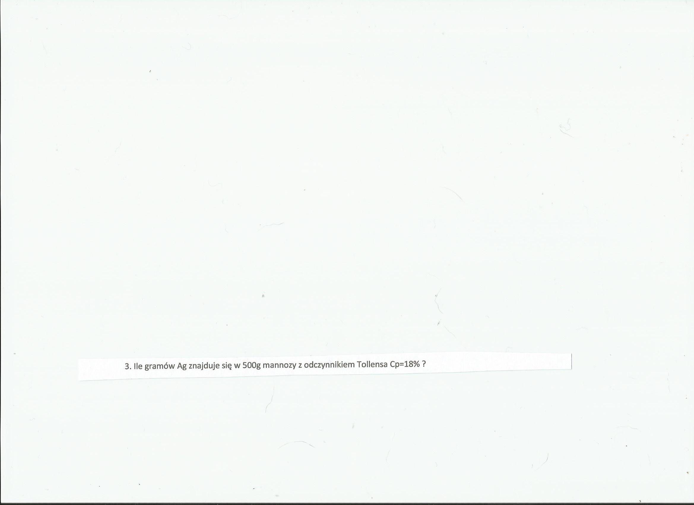Rozumiem,że podane stężenie dotyczy mannozy , a chodzi o ilość wydzielonego srebra w reakcji z odczynnikiem Tollensa. Uproszczone równanie reakcji : C_{6}H_{12}O_{6} + Ag_{2}O \to C_{6}H_{12}O_{7} + \downarrow 2Ag Masa molowa mannozy : M_{mannoza} =6\cdot 12 + 12\cdot 1 + 6\cdot 16=180g/mol Ilość mannozy zawarta w 500g 18% roztworu : 500g\cdot 18\%=500g\cdot 0,18=90g \ mannozy Z reakcji wynika,że 1mol (180g) mannozy powoduje wydzielenie 2moli (2*108g) srebra : 180g \ mannozy \to 2\cdot 108g \ Ag 90g \ mannozy \to x \ g \ Ag x=\frac {90g\cdot 2\cdot 108g} {180g}=108g \ Ag Znajduje się 108g srebra.