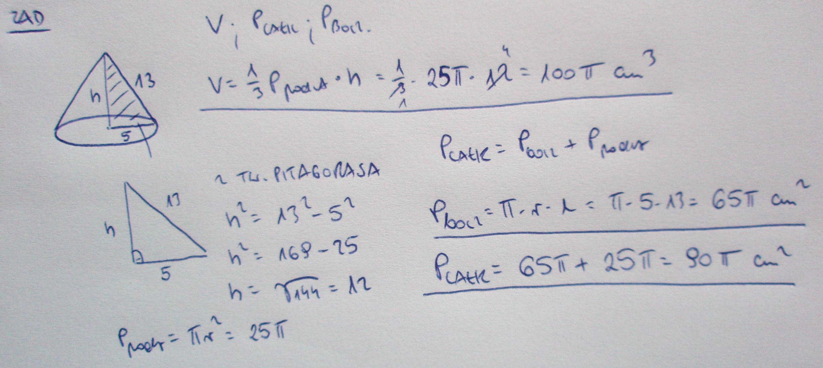 promien podstawy stozka wynosi 5cm a tworzaca 13cm.oblicz objetosc,pole powierzchni bocznej i calkowitej tego stozka.