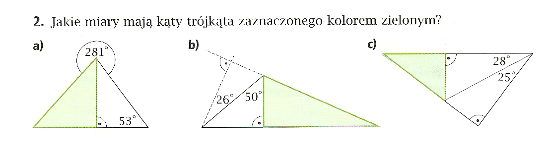 Jakie miasry mają kąty trójkąta zaznaczonego kolorem zielonym ? Prtosiłabym do tego zadania całe obliczenia