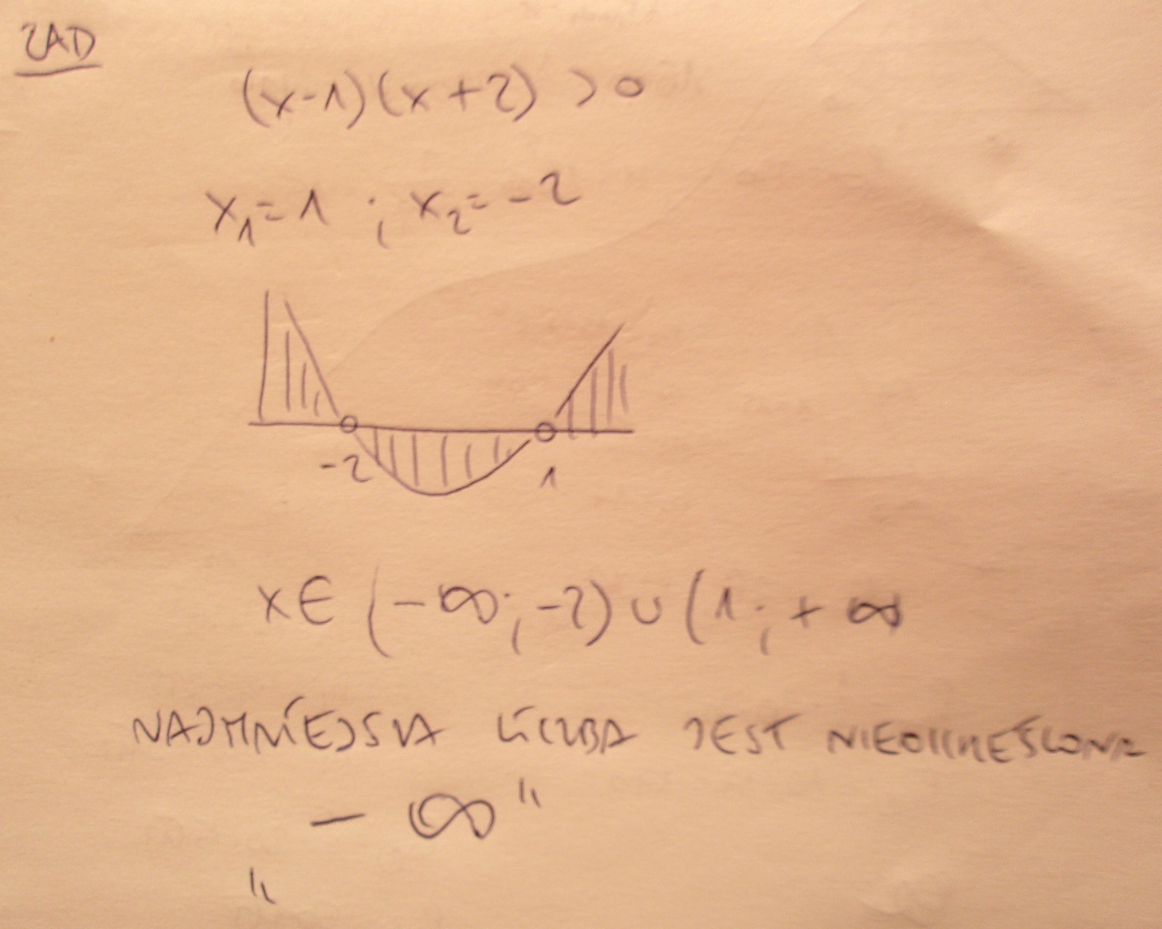 Najmniejsza liczbą należąca do zbioru rozwiazań nierówności (x-1)(x+2)> 0 jest ?
