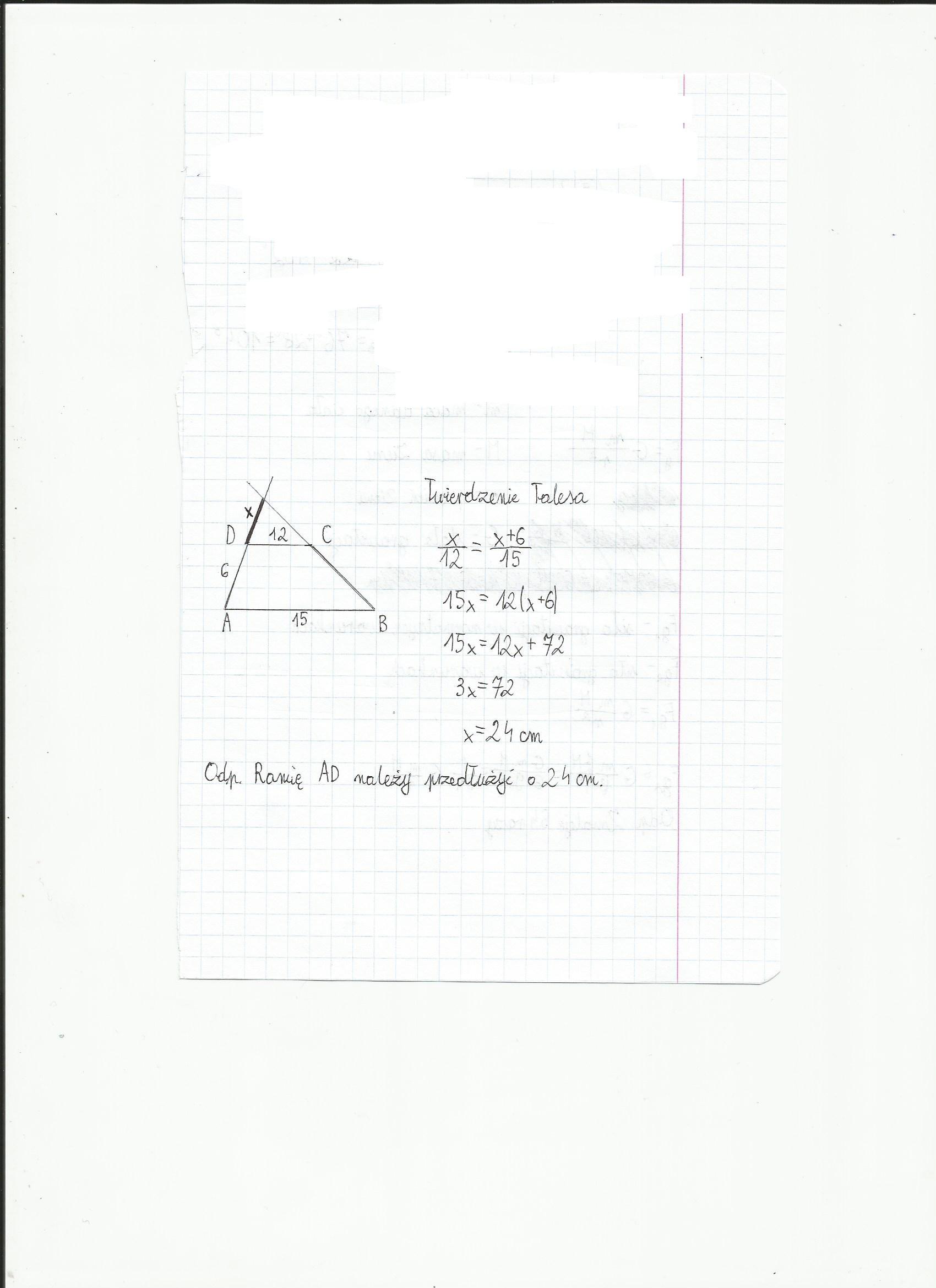 W trapezie ABCD podstawy AB iCD oraz ramię AD mają długości odpowiednio 15 cm ,12cm i 6cm.O ile centymetrów należy przedłużyć ramię AD, by przecieło się z z przedłużeniem ramienia BC?