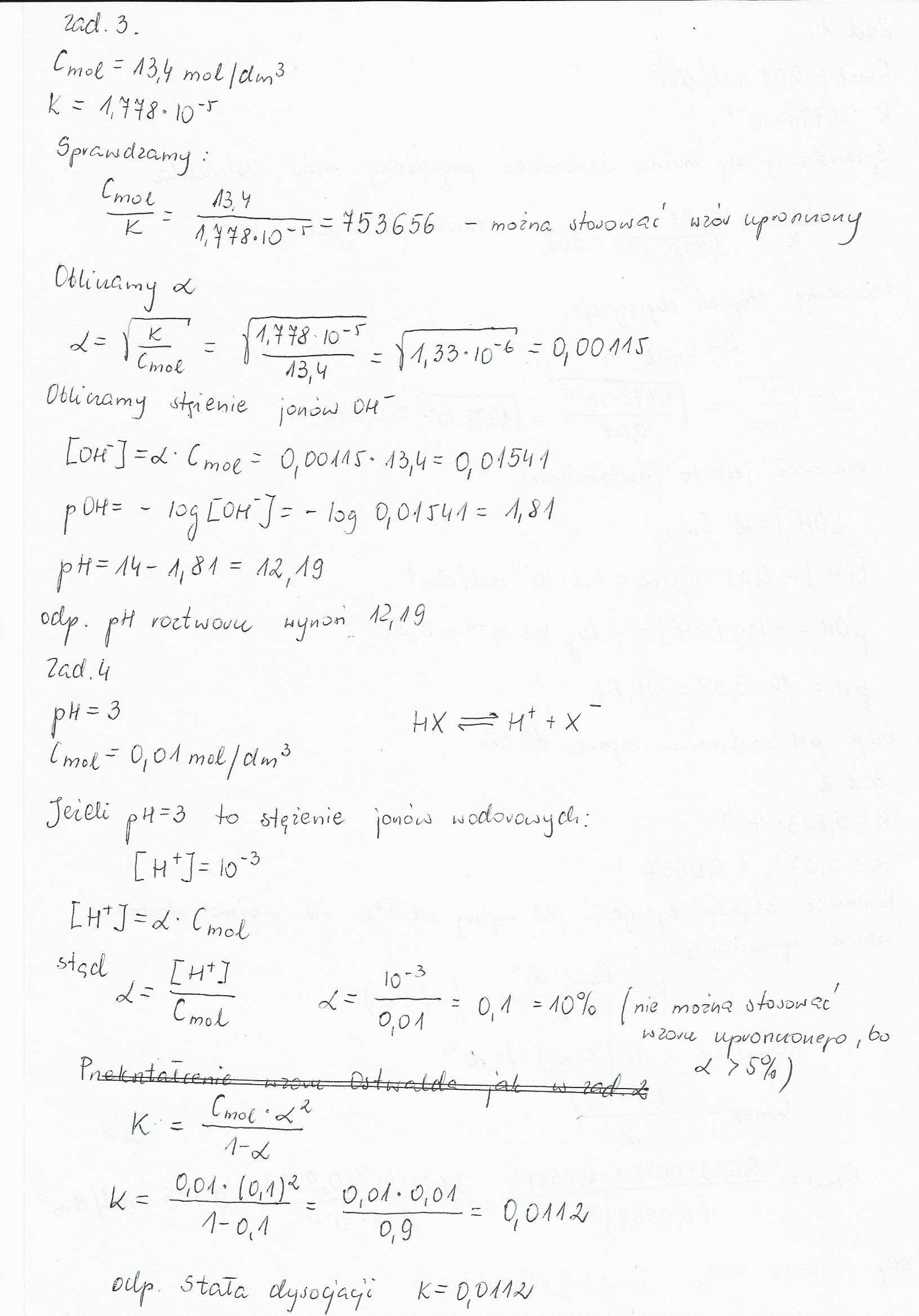 Wartość pH wodnego roztworu kwasu monokarboksylowego o stężeniu molowym 0,01 mol/ dm3 wynosi w przybliżeniu 3. Oblicz stałą dysocjacji tego kwasu.