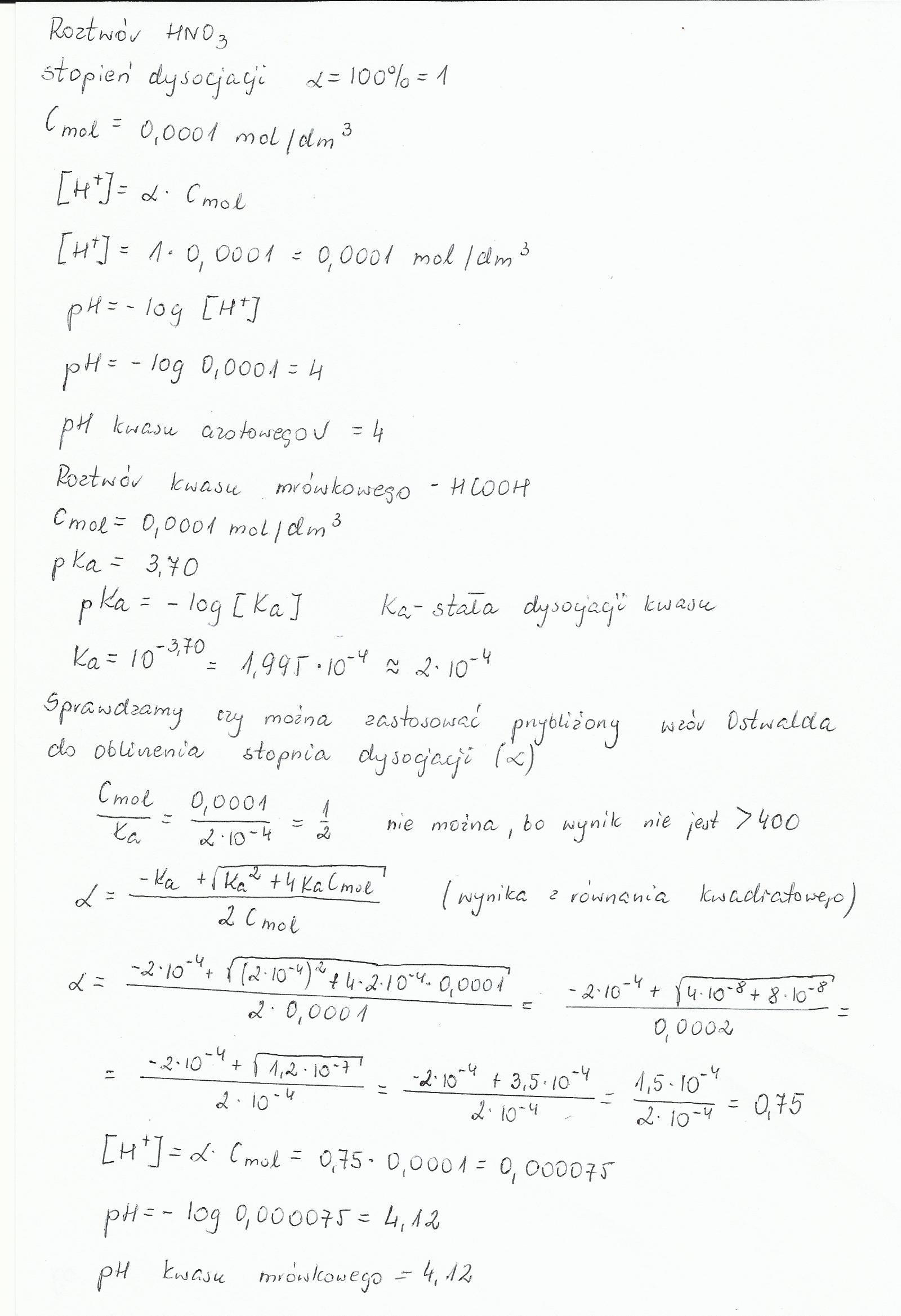 Oblicz i podaj jakie będzie pH 0,0001M roztworu kwazu azotowego ( HNO3 ) a jakie pH roztworu kwasu mrówkowego o tym samym stężeniu, wiedząc że pKa kwasu mrówkowego wynosi 3,70.