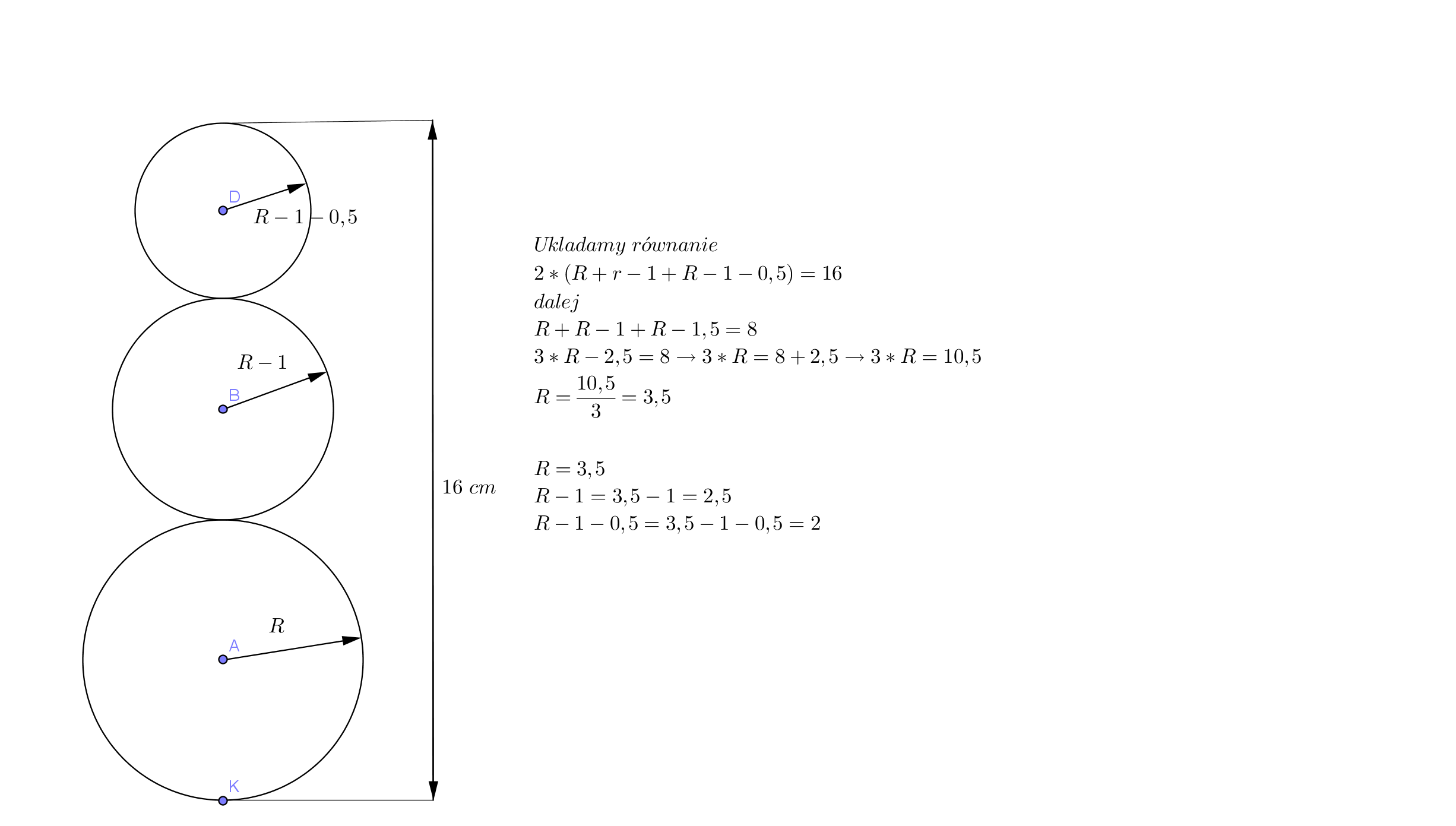 Kasia narysowała bałwana. Składał sie z trzech kół położonych jedno na drugim. Promień górnego koła był o 5 mm mniejszy od promienia koła środkowego, a promień koła środkowego był o 1 cm mniejszy od promienia koła dolnego. Cały bałwan miał wysokość 16 cm. Jaki promień miało każde z kół?
