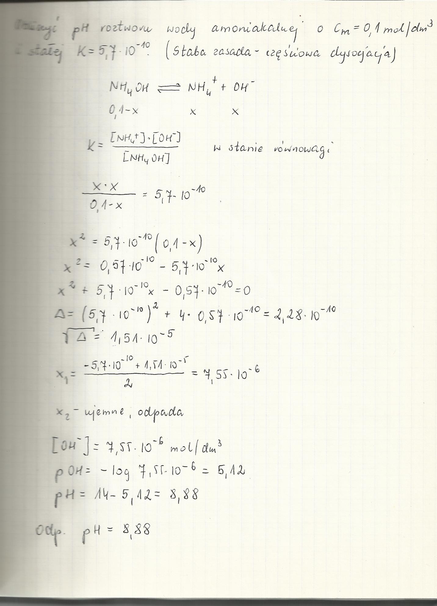 Oblicz pH roztworu wody amoniakalnej o Cmol= 13,4 mol/dm3 i stałej K= 1,778x 10 do potęgi -5. ( na rownaniach kwadratowych)
