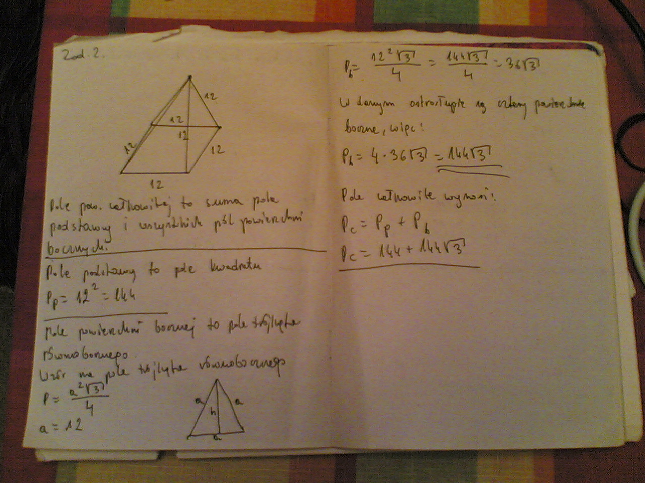W ostrosłupie prawidłowym czworokątnym wszystkie krawędzie mają długość 12cm. Oblicz rolę powierzchni całkowitej tego ostrosłupa.