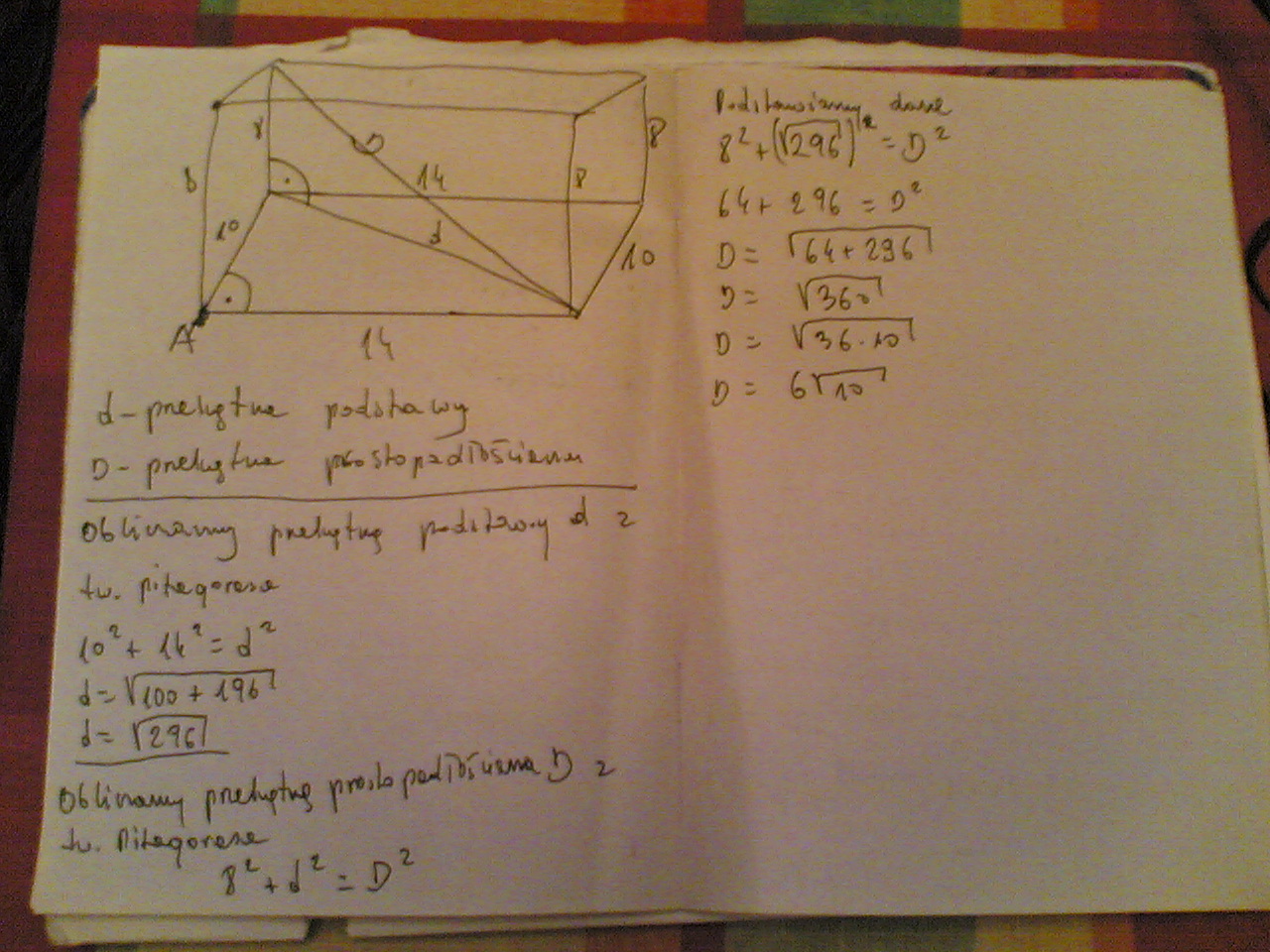 w prostopadłościnie krawędzie wychodzące z jednego wierzchołka mają długość 8cm,10cm i 14cm. Oblicz długość przekątnej graniastosłupa.