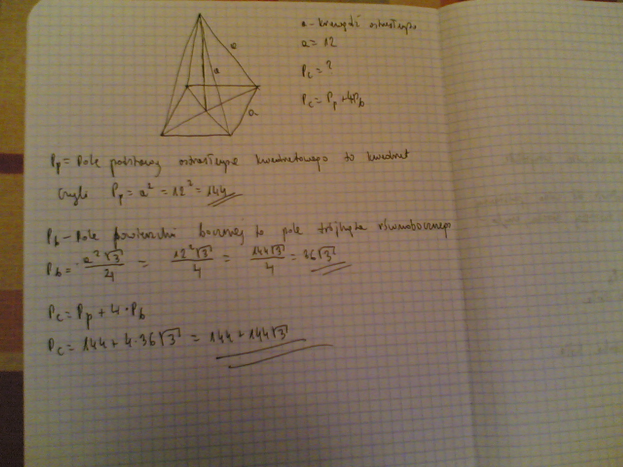 W ostrosłupie prawidłowym czworokątnym wszystkie krawędzie mają długośc 12 cm .Oblicz pole powierzchni całkowitej tego ostrosłupa