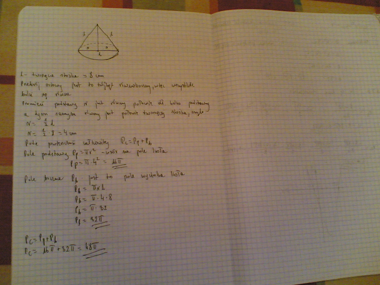 Przekrój osiowy stożka jest trójkątem równobocznym o boku długości 8cm. Oblicz rolę powierzchni całkowitej tego stożka