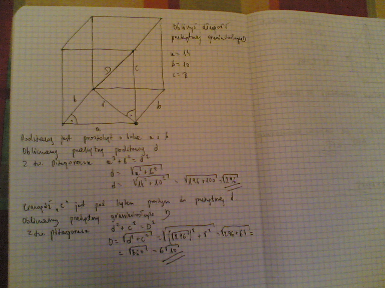 w prostopadłościnie krawędzie wychodzące z jednego wierzchołka mają długość 8cm,10cm i 14cm. Oblicz długość przekątnej graniastosłupa.