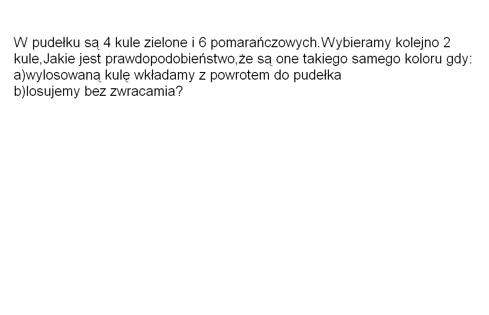 Jak widać brak zwracania zmniejsza szansę na 2 kule w tym samym kolorze. Nic dziwnego, ponieważ zabranie np. jednej zielonej kuli bez zwracania zmniejsza szansę na następną zieloną w porównaniu ze schematem ze zwracaniem.
