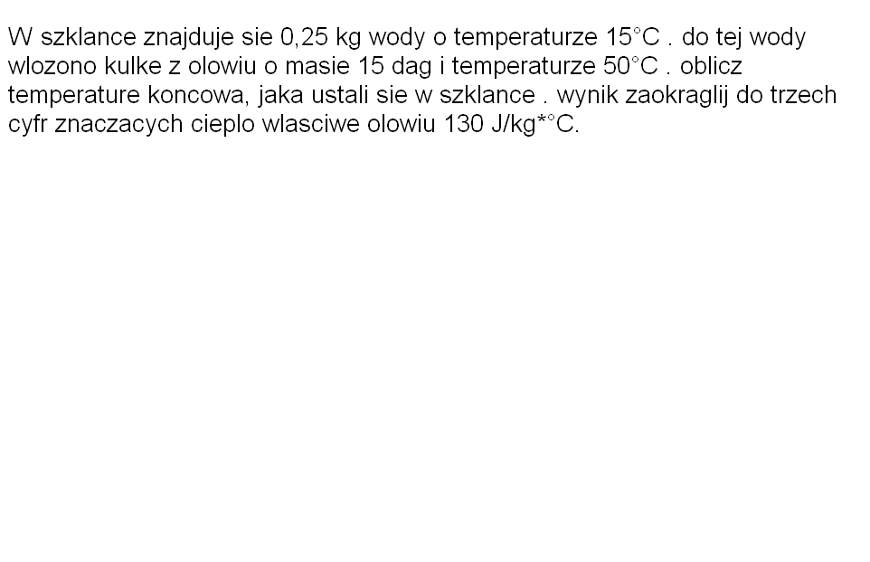 Jak widać przyrost temperatury jest niewielki z powodu małego ciepła właściwego ołowiu w porównaniu z ciepłem właściwym wody (ponad 30 razy większym). Masa ołowiu też była nieco mniejsza od masy wody.