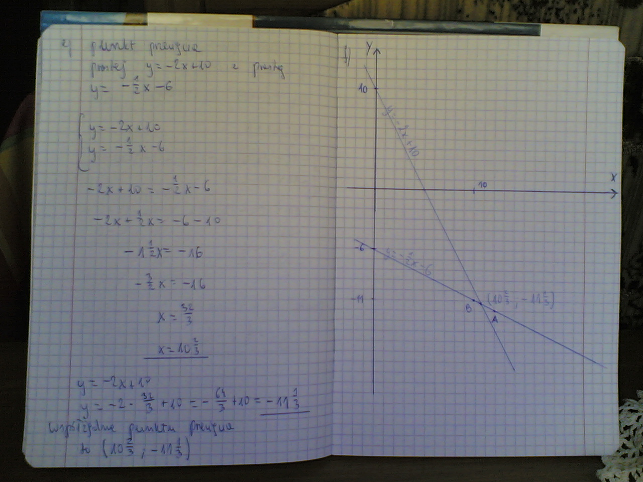 e. Oblicz punkt przecięcia się prostej m: y= -2x+10 z prostą K ( za pomocą układu równań)