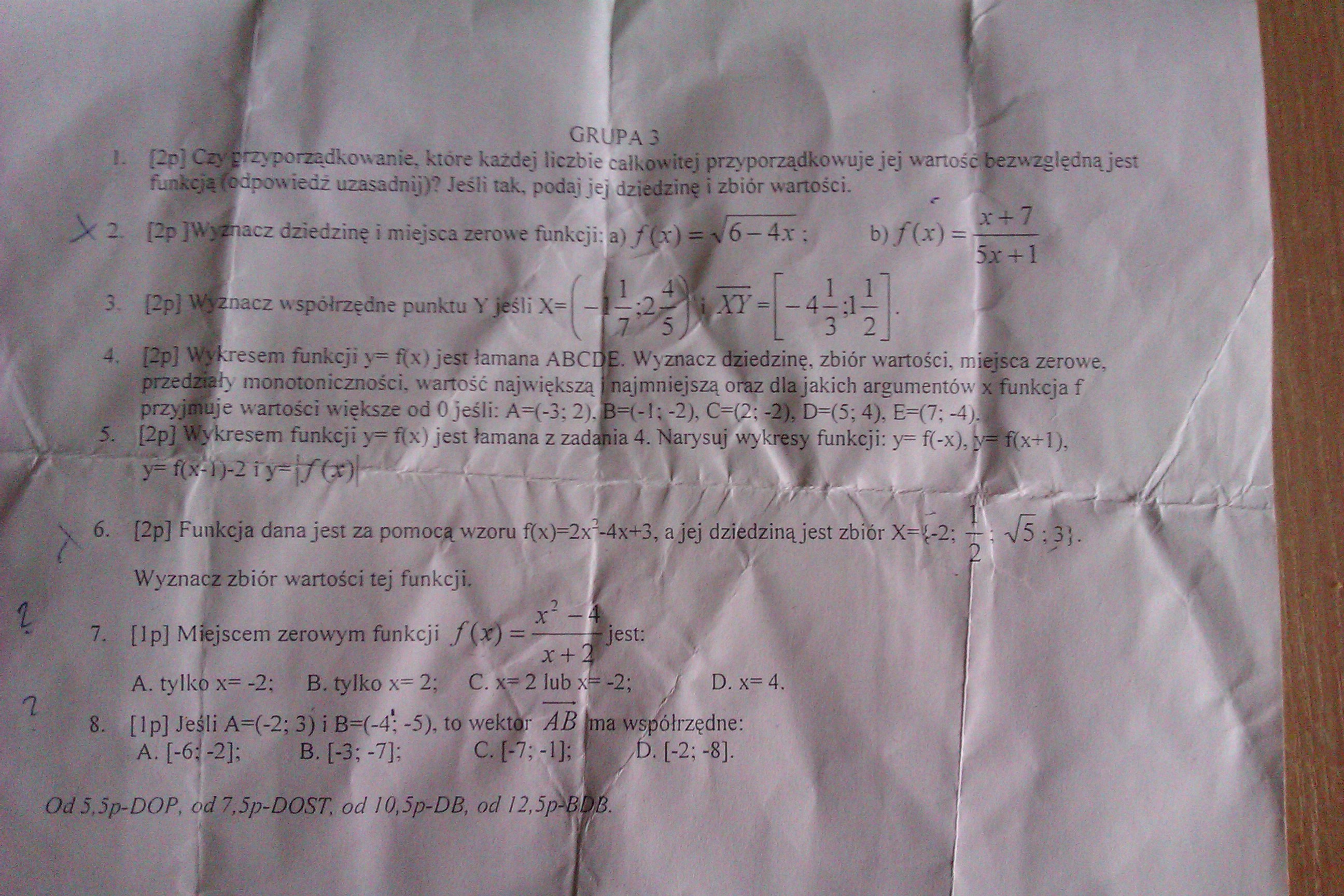 Funkcje !!! Potrzebuję jeszcze na dziś. Pisałem ostatnio sprawdzian z funkcji i niestety go zawaliłem ... Prosiłbym o rozwiązanie jego i w miarę możliwości wytłumaczenie tego w jaki sposób go rozwiązaliście :D Z góry dziękuję :D Zdjęcie sprawdzianu w załączniku.