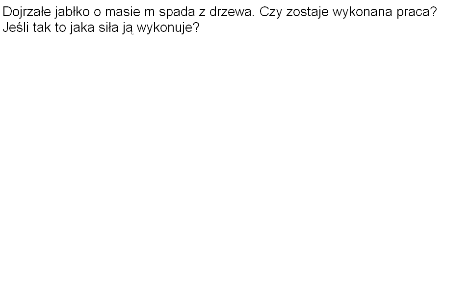 Ale z NASZEGO punktu widzenia ta praca jest ujemna (pole grawitacyjne wykonuje pracę za nas), ale że jest ona całkowicie realna można się przekonać podnosząc jabłko z powrotem na drzewo. Wtedy MY wykonujemy pracę, a pole grawitacyjne się cieszy bu mu zwracamy tą energię, którą straciło przyciągając jabłko.