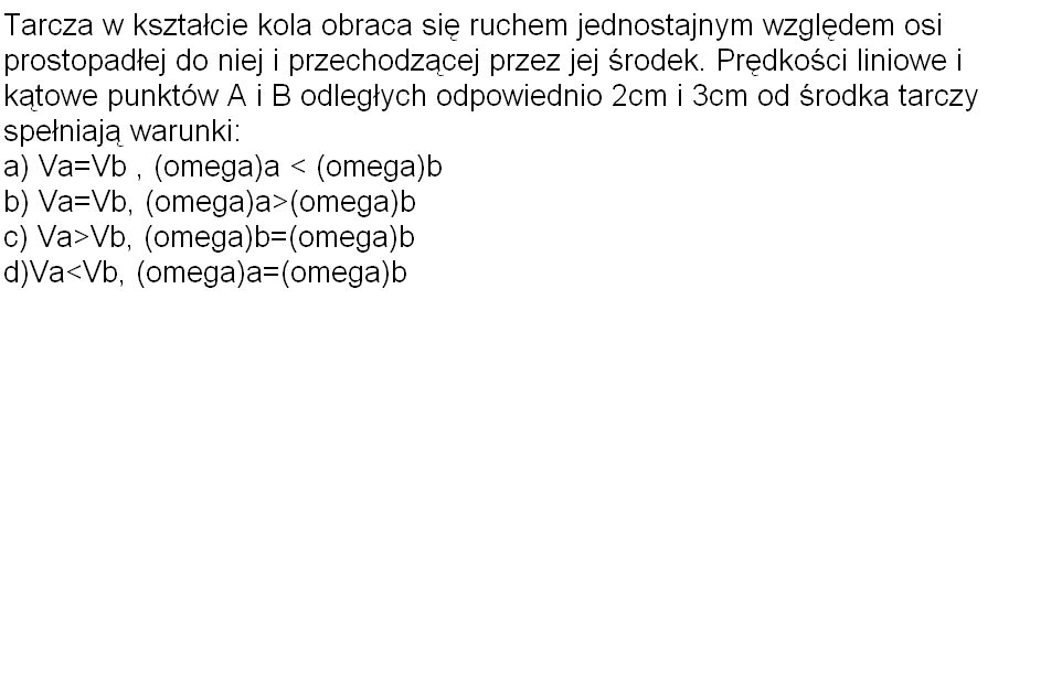 Przy jednostajnym ruchu obrotowym prędkości kątowe każdego punktu obracającego się ciała są jednakowe. To wyklucza odpowiedzi (a) i (b).