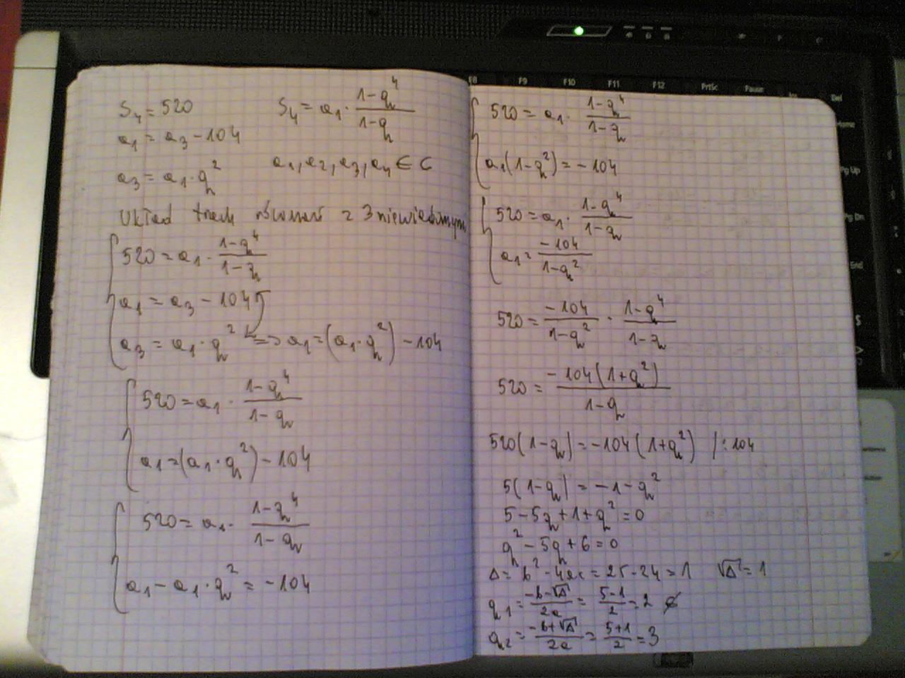 Zapisz liczbę 520 jako sumę czterech liczb całkowitych będących pierwszymi czterema wyrazami ciągu geometrycznego, którego pierwszy wyraz jest o 104 mniejszy od trzeciego wyrazu.