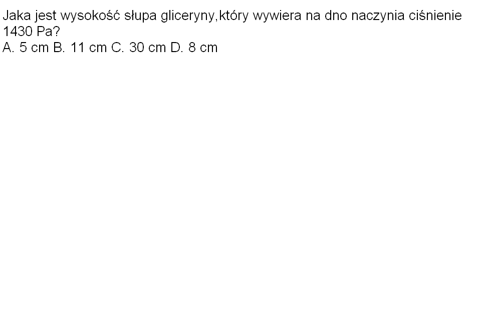 h = 1430 / (1260 * 10) = około 0,11 m, czyli 11 cm. Odp. B.