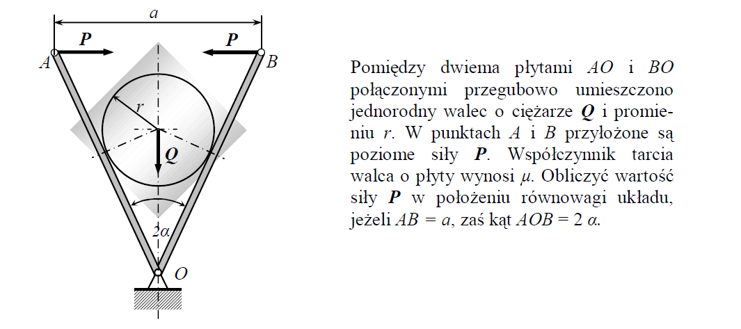 Pomiędzy dwiema płytami AO i BO połączonymi przegubowo umieszczono jednorodny walec o ciężarze Q i promieniu r. W punktach A i B przyłożone są poziome siły P. Współczynnik tarcia walca o płyty wynosi μ.Obliczyć wartość siły P w położeniu równowagi układu, jeżeli AB = a, zaś kąt AOB = 2 α