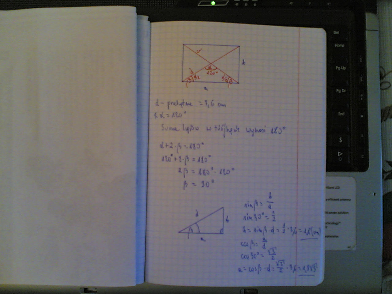 4.3 W prostokącie dana jest długość przekątnej d=3,6 cm oraz miara kąta zawartego między przekątnymi alfa=120 stopni. Oblicz długości boków tego prostokąta.
