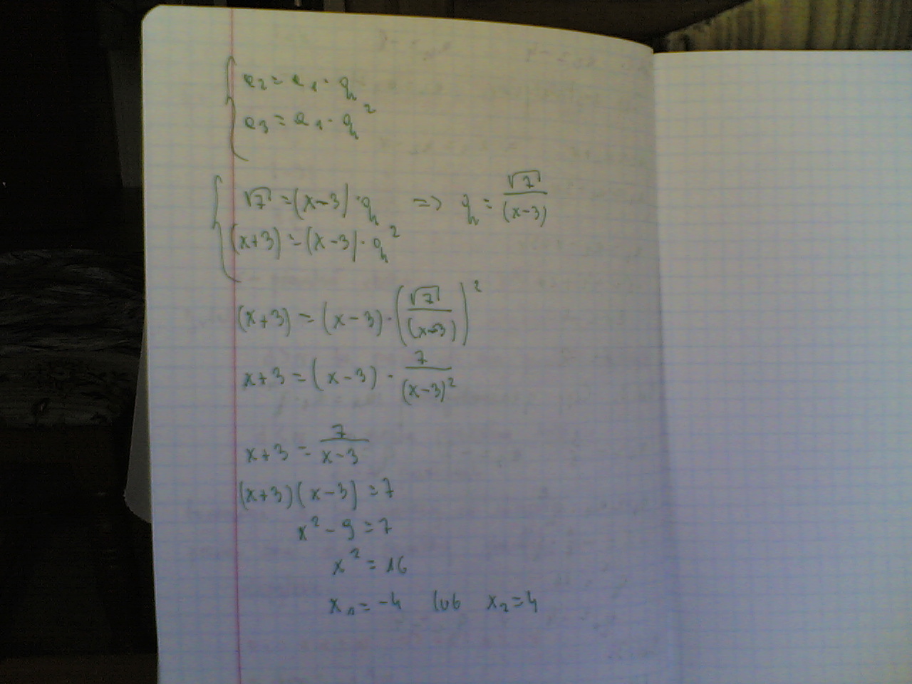3. Liczy x-3, pierwiastek z 7, x+3 tworza w danej kolejnosci ciag geometryczny. wynika stad, ze