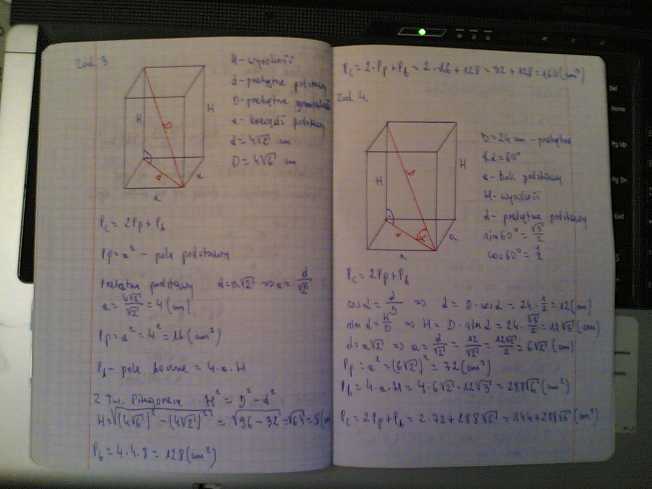 Przekątna podstawy graniastosłupa prawidłowego czworokątnego ma 4√2 cm, a przekątna graniastosłupa jest równa 4√6cm. Pole powierzchni całkowitej graniastosłupa wynosi?