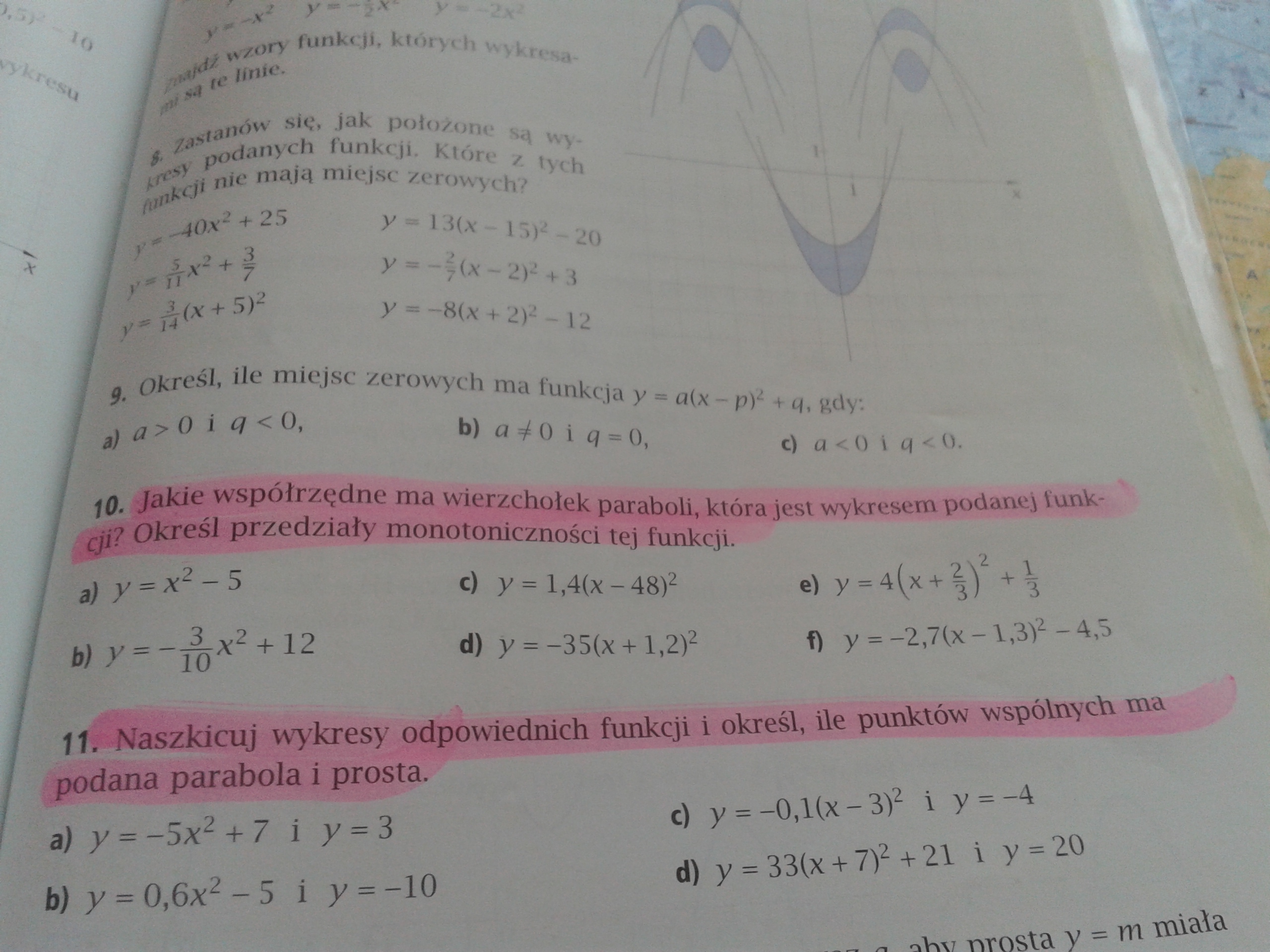 11.naszkicuj wykresy odpowiednich funkcji i okresl , ile punktow wspolnych ma podana parabola i prosta.