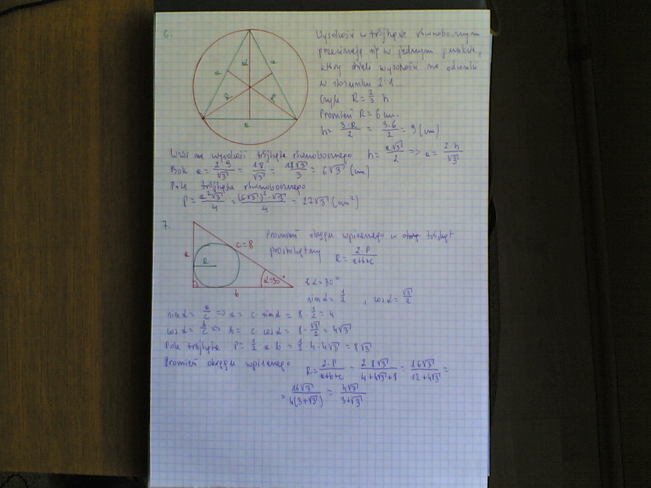6. oblicz wysokosc oraz pole trójkąta równobocznego na którym opisano okrąg o peomieniu 6 cm.....