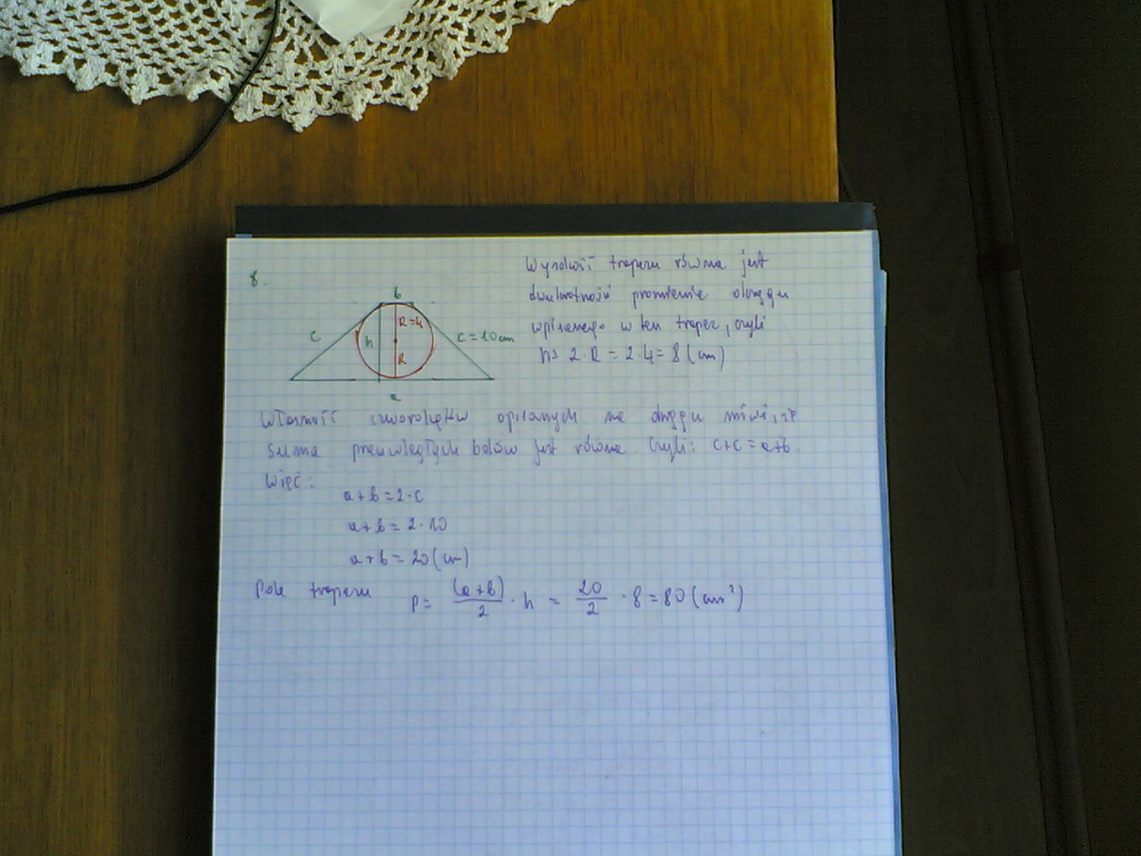 8. oblicz pole trapezu rownoramiennego o ramieniu o długości 10 cm opisanego na okregu o promieniu 4 cm