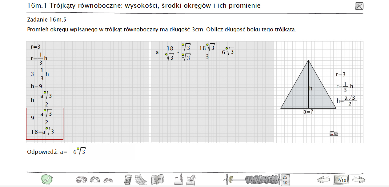 ponieważ wysokość trójkąta równobocznego wynosi 9 , a wzór do obliczenia tej wysokości przedstawia się :