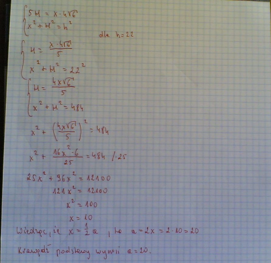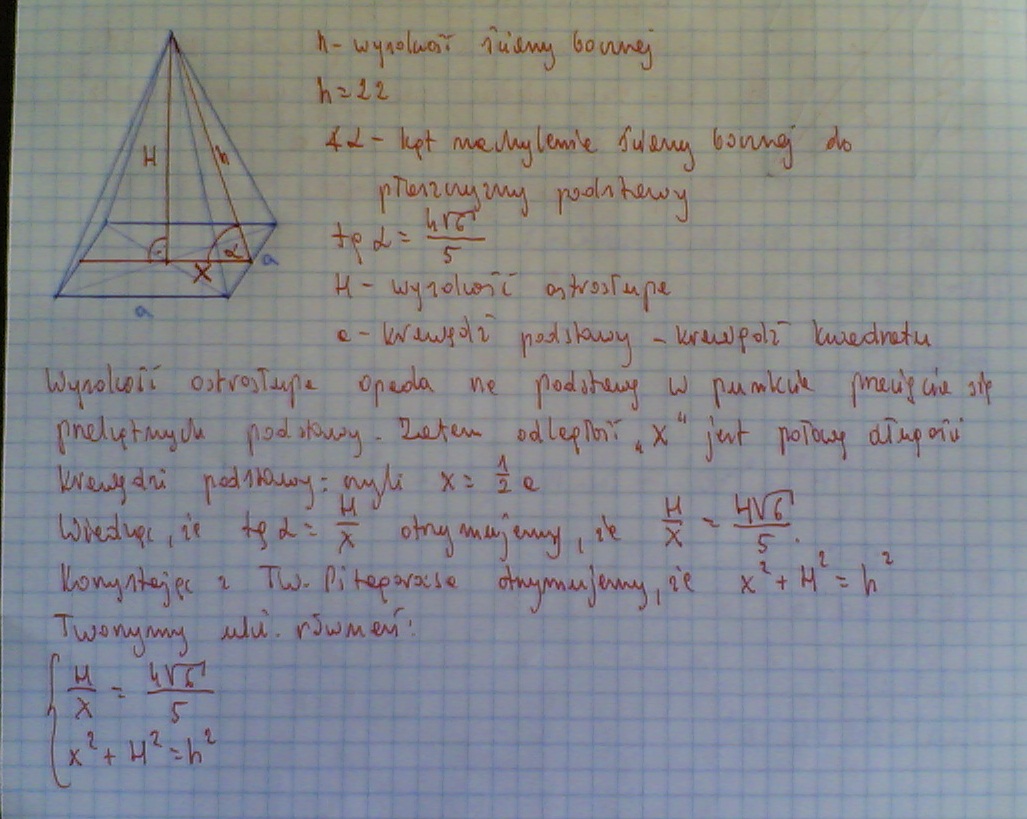 Podstawę ostrosłupa prawidłowego jest kwadrat wysokość ściany bocznej tego ostrosłupa jest równa 22 a tg kąta nachylenia ściany bocznej ostrosłupa do płaszczyzny jego podstawy jest równy 4 pierwiastki z 6 / . Oblicz długość krawędzi podstawy.