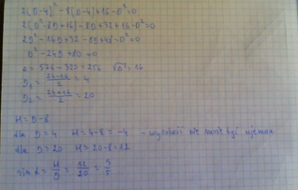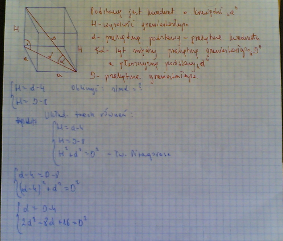 W graniastosłupie prawidłowym czworokątnym wysokość jest o 4 krótsza od przekątnej podstawy i o 8 krótsza od przekątnej graniastosłupa. Oblicz sin kąta alfa między przekątną graniastosłupa a płaszczyzną podstawy.