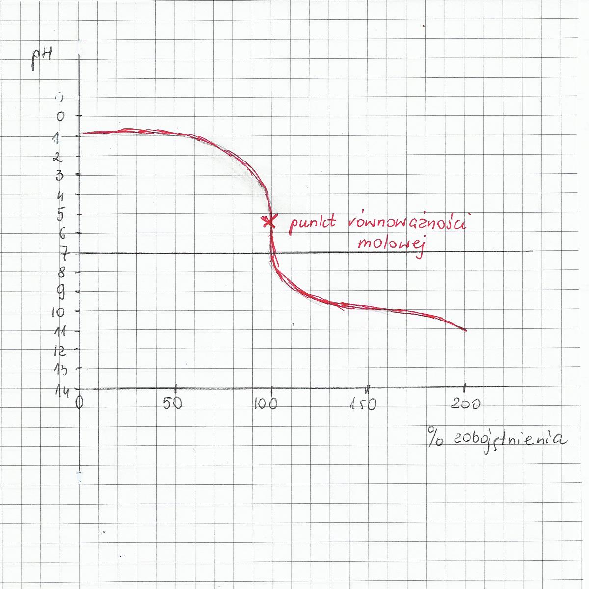W początkowym punkcie miareczkowania wartość pH wynosi 1 ,ponieważ mocny kwas jest całkowicie zdysocjowany na jony. Podczas miareczkowania słabą zasadą wartości pH zmieniają się nierównomiernie - najpierw wzrastają powoli,a po zobojętnieniu 90% kwasu wzrastają bardzo szybko - następuje nagły skok wartości pH.Potem wartość pH wzrasta dalej do ok.11.