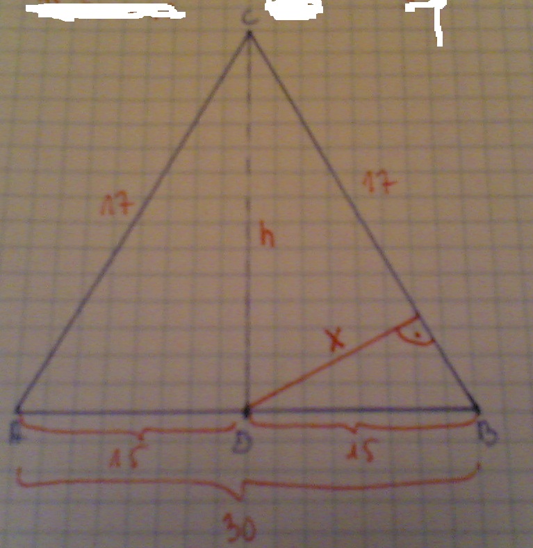 1. W trójkącie równoramiennym ABC mamy dane AB=30cm, BC=AC=17cm. Obliczyć odległość środka D podstawy AB od ramienia BC