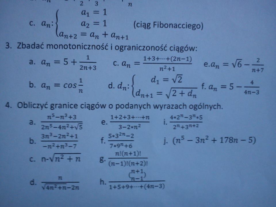 3e) Gdy n --> oo ułamek dąży do zera więc ciąg ma granicę równą pierwiastek(6), Jest więc ograniczony Badamy różnicę wyrazów a(n+1) - a(n) a_{n+1} - a_n = -\frac{1}{n+1+7}+\frac{1}{n+7}=\frac{-n-7+n+8}{(n+8)(n+7)}=\frac{1}{(n+8)(n+7)} Różnica jest dodatnia więc ciąg jest rosnący