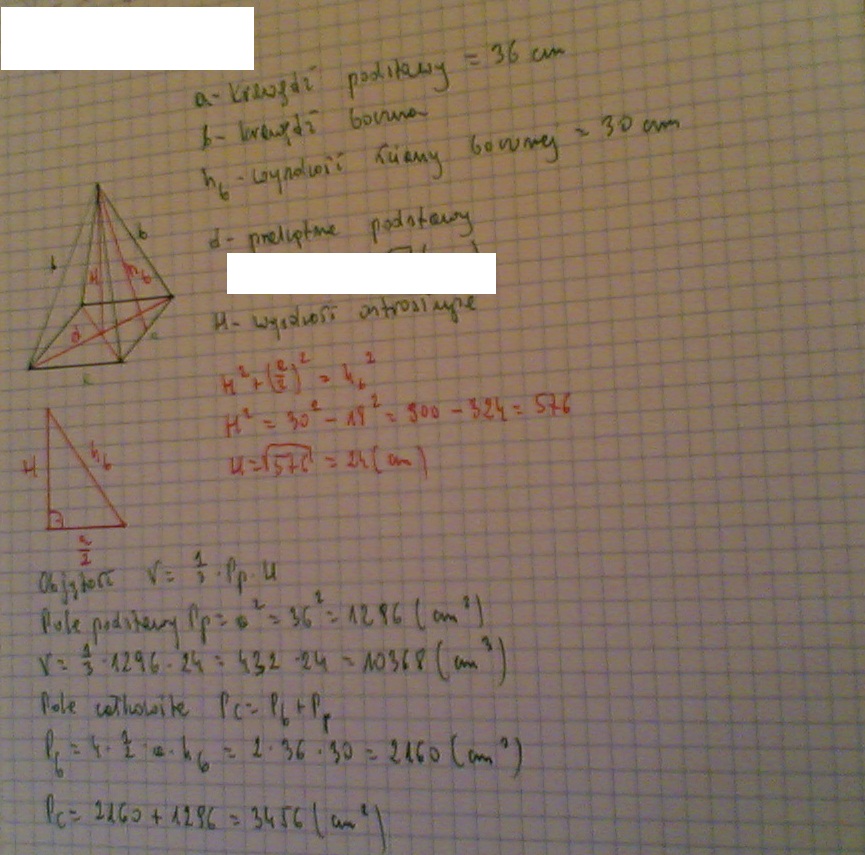 Oblicz pole powierzchni całkowitej i objętość ostrosłupa prawidłowego o podstawie czworokąta którego krawędź podstawy jest równa 36 cm a wysokość ściany