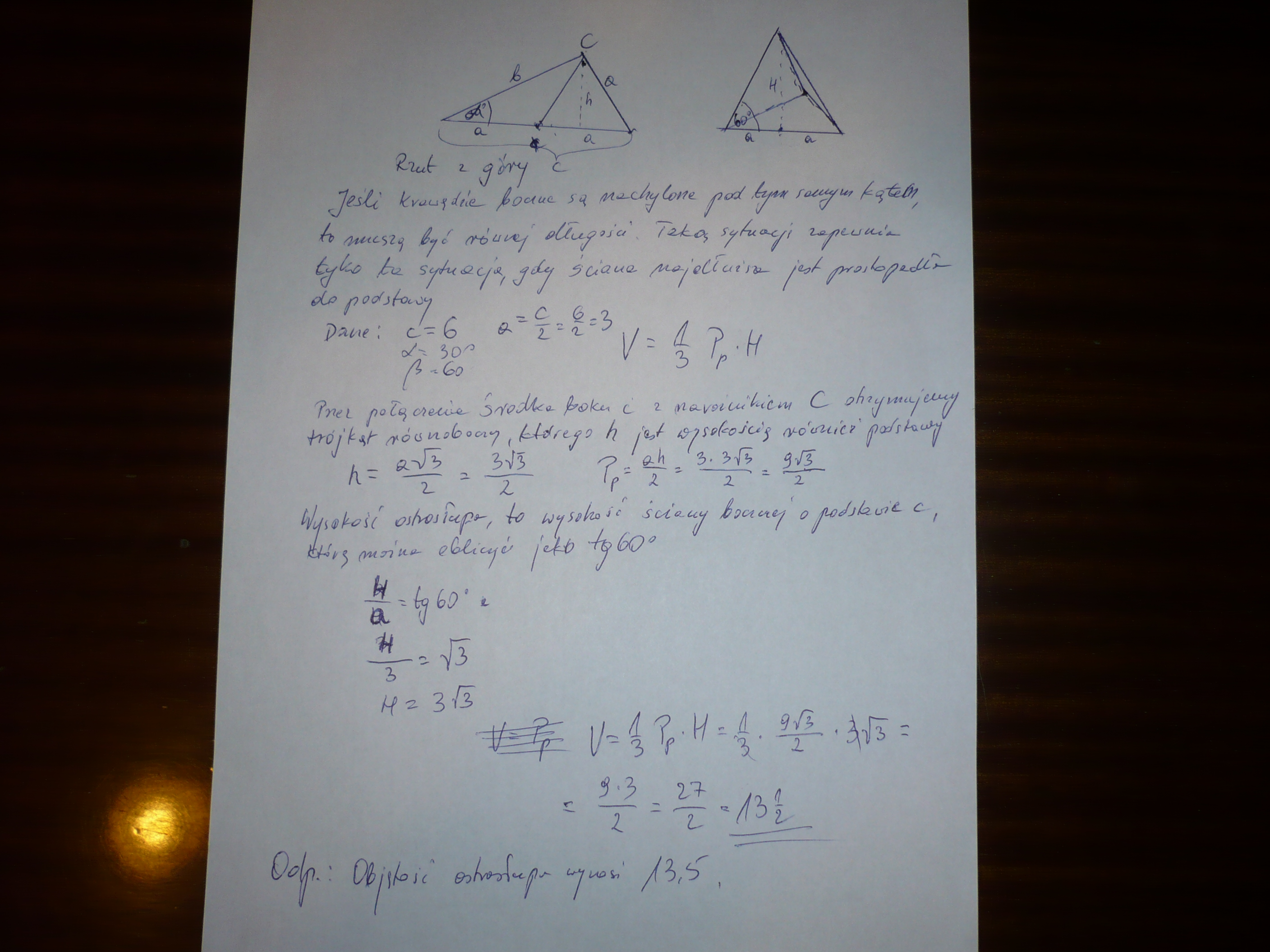 Podstawą ostrosłupa jest trójkąt prostokątny o przeciwprostokątnej równej 6 i kącie ostrym 30 stopni. Krawędzie boczne są nachylone do płaszczyzny