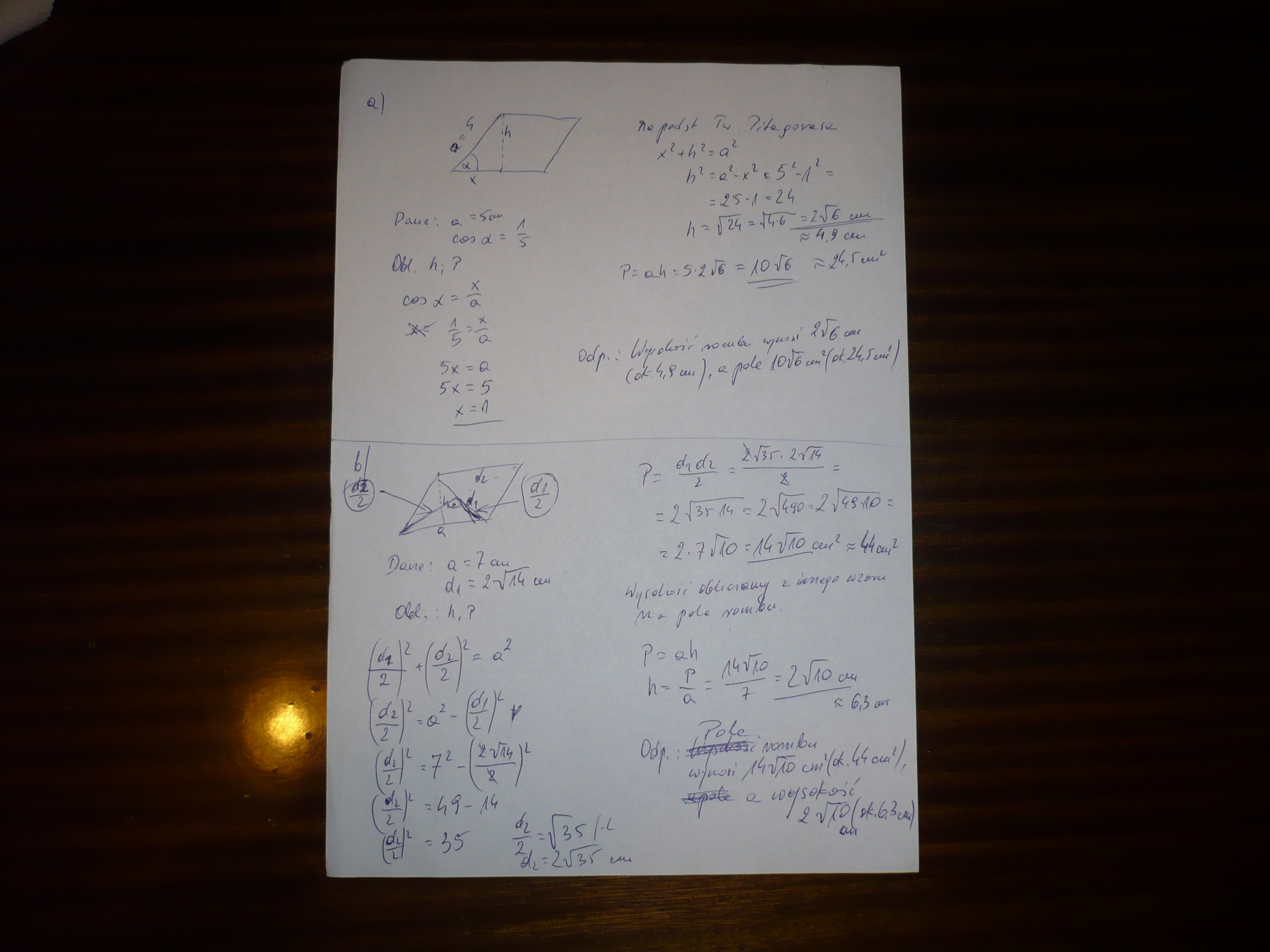 a) o boku 5cm i kącie ostrym alfa takim, że cos alfa= 1/5