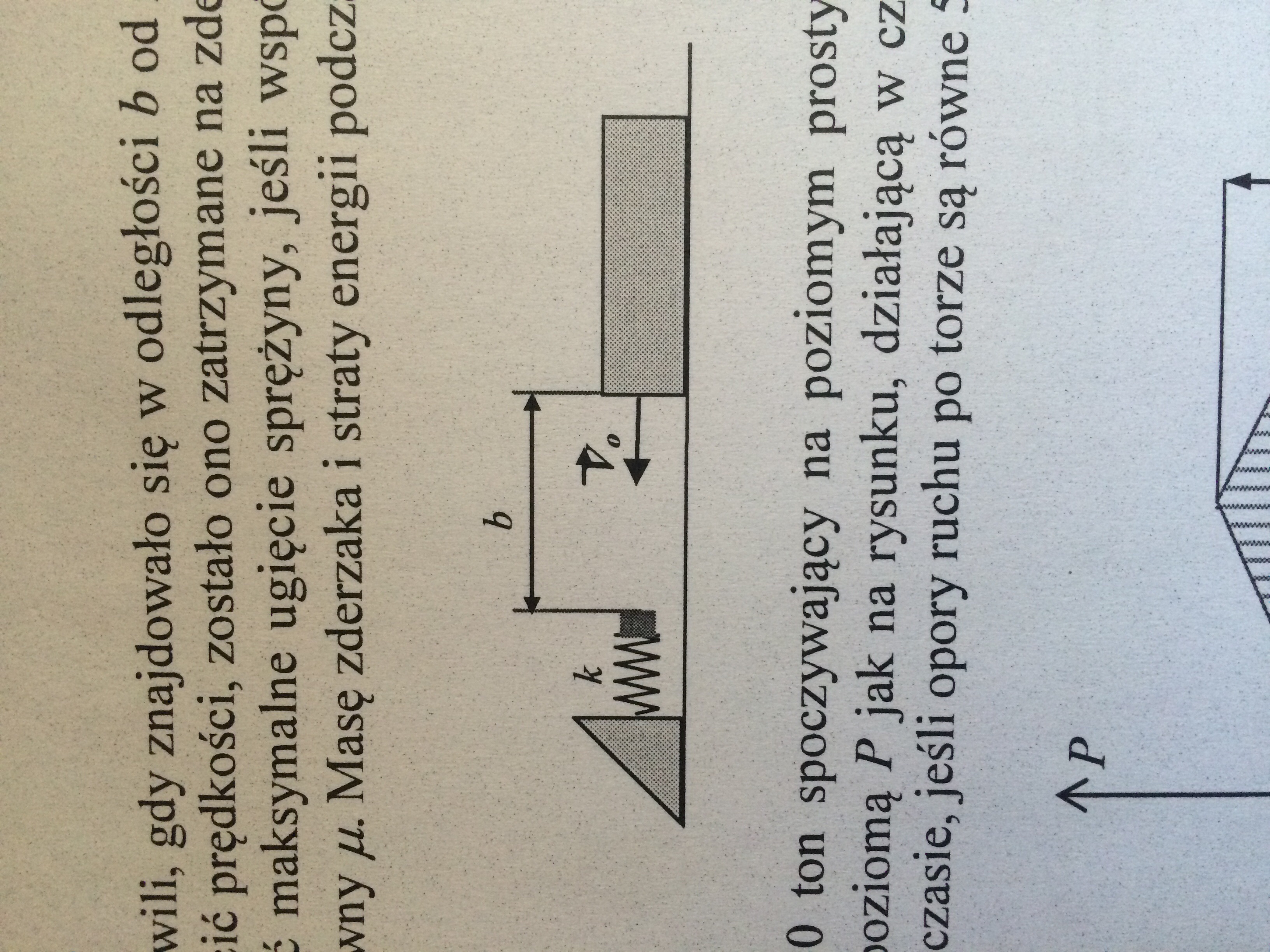 Ciało o masie m w chwili, gdy znajdowało się w odległości b od zderzaka miało prędkość Vo. Nie zdążywszy wytracić prędkości, zostało ono zatrzymane na