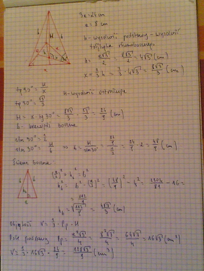 Oblicz Pole całkowite i objętość ostrosłupa prawidłowego trójkątnego wiedząc,że obwód podstawy jest równy 24cm a kąt nachylenia krawędzi bocznej do podstawy jest równy 30 stopni.