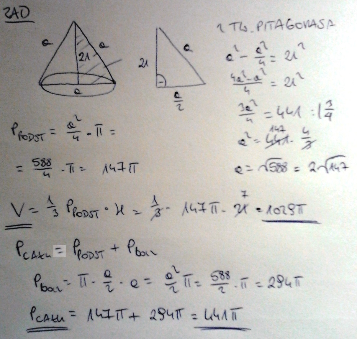 Przekrojem osiowym stożka jest trójkąt równoboczny,którego wysokość równa się 21 cm. Oblicz objętość i pole całkowite stożka