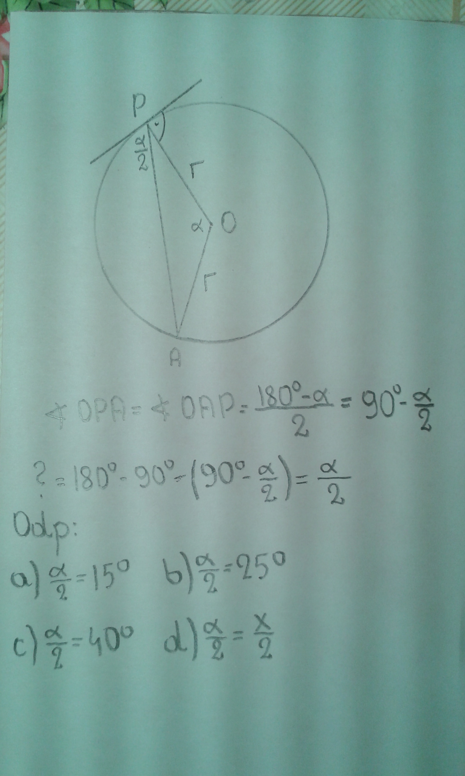 przez punkt P nalezacydo okregu o srodku O poprowadzono styczna do tego okregu i cieciwe PA,ile stopni ma kat miedzy styczna i cieciwa jezeli kat AOP ma