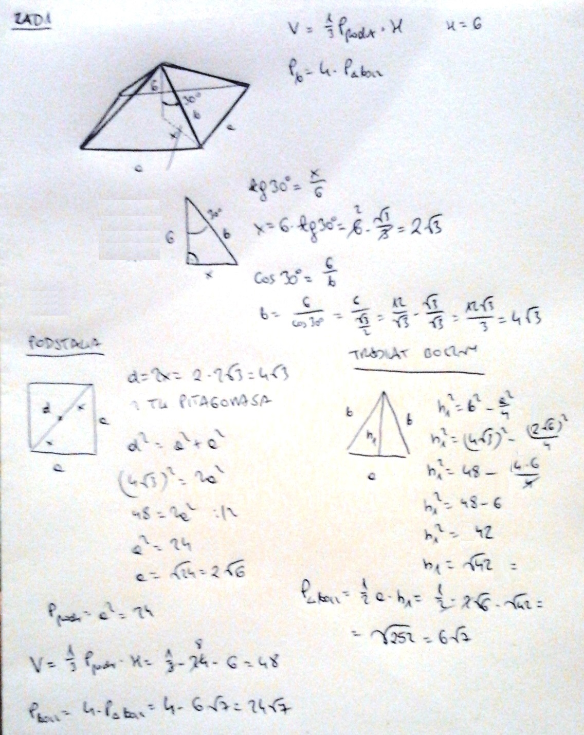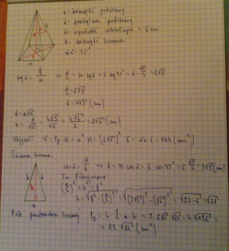 1)wysokość ostrosłupa prawidłowego czworokątnego wynosi 6cm tworzy z krawędzią boczną kąt 30 stopni.oblicz Pb i V